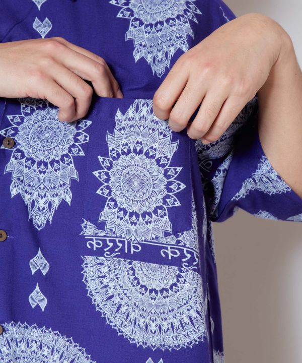 【Amina×VORRUK】タイのアーティストVORRUKとのコラボ。ロータスなどの植物を描いた絵を、単色の総柄に落とし込んだデザインのメンズシャツ。柔らかくて涼しいレーヨン素材で着心地抜群の開襟メンズシャツ。