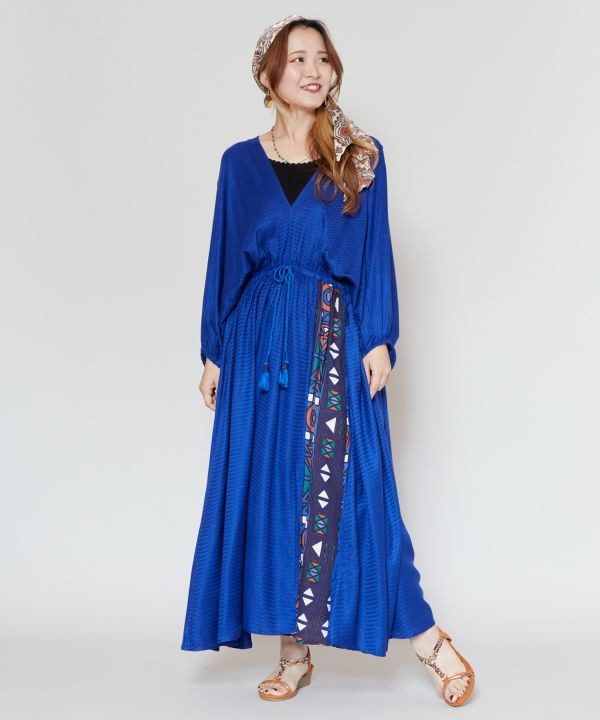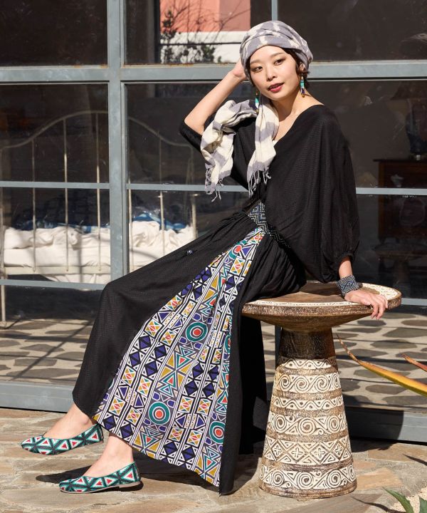 南アフリカに居住する「ンデベレ族」のトレードマークといわれる、住居に描かれた幾何学模様の壁画アートから着想を得たシリーズ。その壁画はアイデンティティを守るために描かれたとも言われている。涼しげなレーヨンはドビー素材で、スタイル良くすっきり着ていただけます。スカート部分に見える柄が印象的。