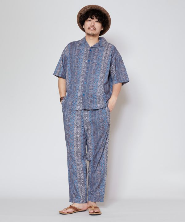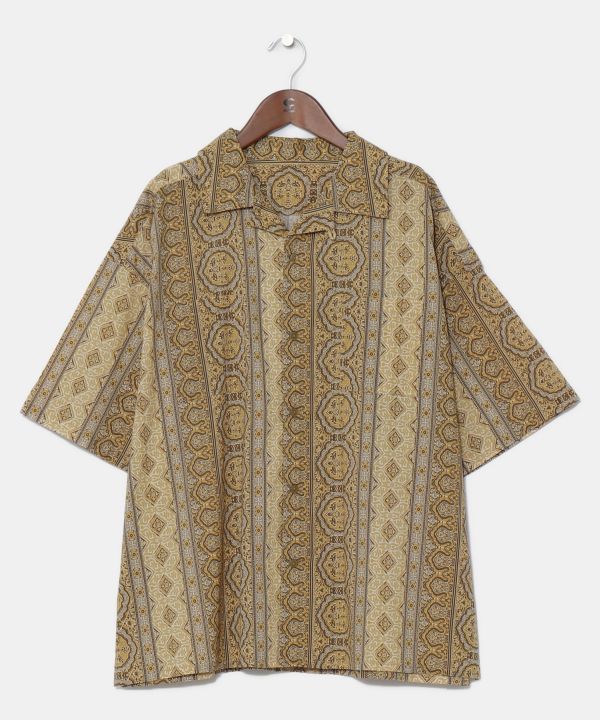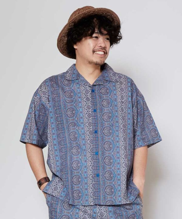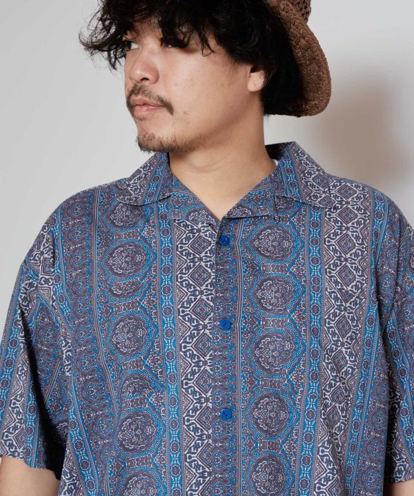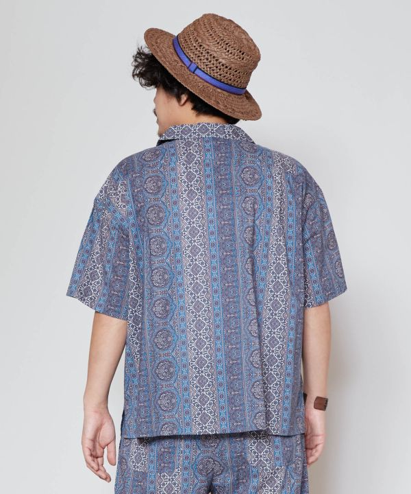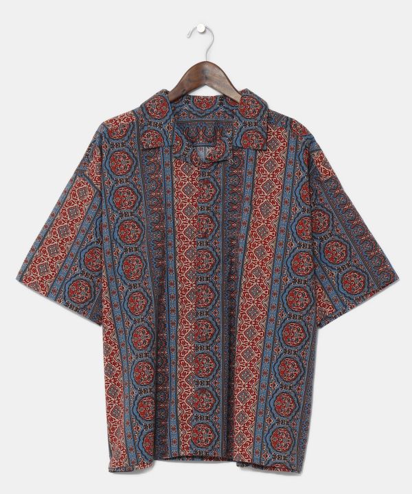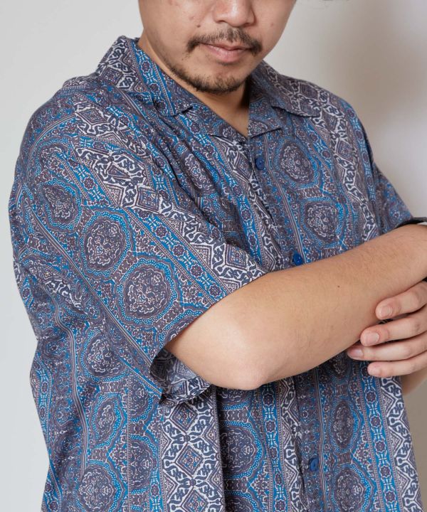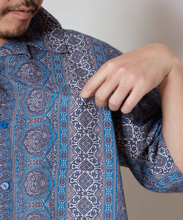 インドの伝統技法アジュラックプリントがモチーフのメンズシャツ。天然染料を使用して染色された深みのあるシックな色合いが特徴。魅力的なハンドワークをデジタルプリントに落とし込んだ一枚。肌触りの良いインド綿を使用し、着心地と風通しの良さは一度着たら病みつきに。メンズとセットアップでも着られる。