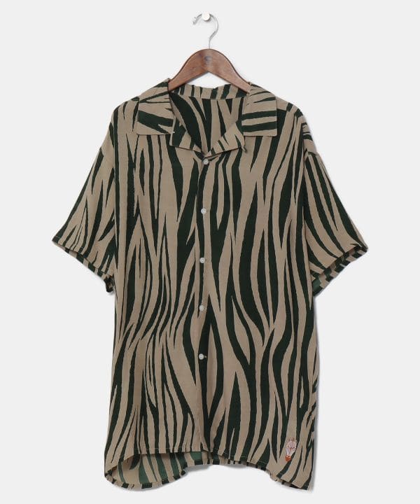 ありそうでないレオパード、シマウマ、牛の三柄の薄手レーヨン素材。ゆったりしたシルエットの開襟シャツ。左裾にワンポイント刺しゅう入り。