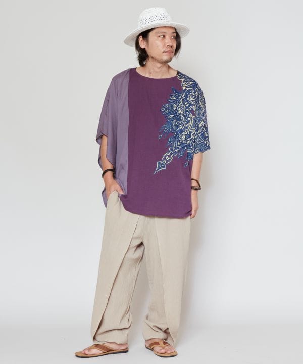 南インドのコーラムからインスパイアされた、メダリオン風のデザインを大胆にプリントしたトップス。オーバーサイズの変形トップスで、コットンとレーヨンの組み合わせが涼しく着られる一枚。