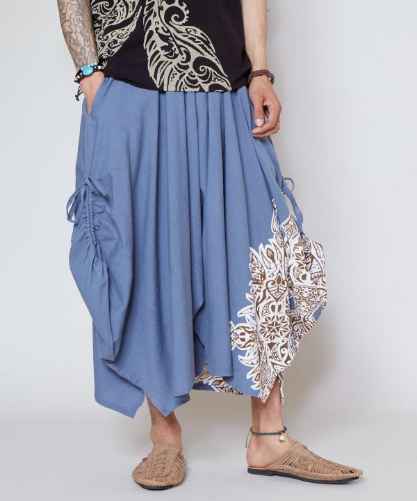 南インドのコーラムからインスパイアされた、メダリオン風のデザインを大胆にプリントしたメンズパンツ。サイドのストリングでシルエットを変えられます。股下が深めなサルエルパンツでゆったりと涼しく着られ、コーデの主役になる一枚。