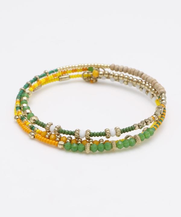 アフリカンなカラーリングとウッドを組み合わせたビーズアンクレット。張りのあるワイヤー形状。