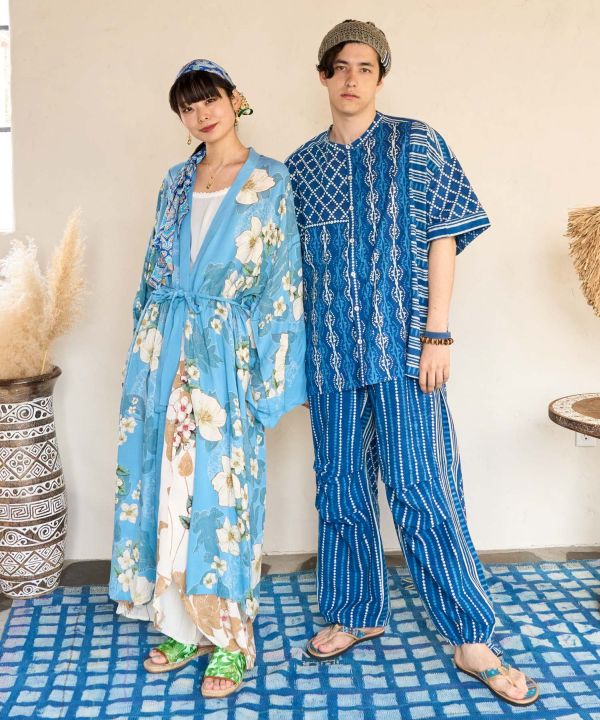 ベジタブルダブブロックプリントという伝統的な技法を使い、あえて古典的ではない柄を表現したチャレンジングな一品。ゆったりとしたシルエットの、ノーカラーシャツ。様々な柄を組み合わせた個性を放つ一枚です。