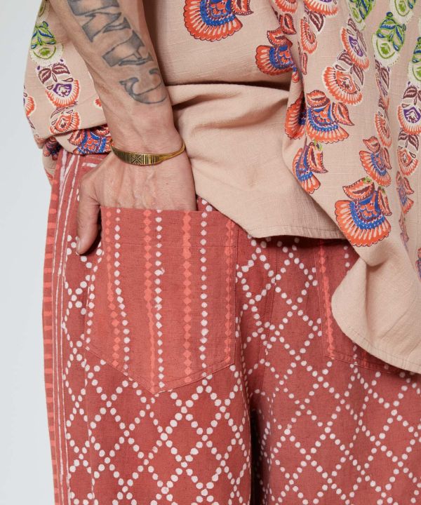 ベジタブルダブブロックプリントという伝統的な技法を使い、あえて古典的ではない柄を表現したチャレンジングな一品。膝のタック加工が立体的なシルエットを作り出し、他には無い個性を作り出します。裾の紐でシルエットの調整も可能な、こだわりの一枚。