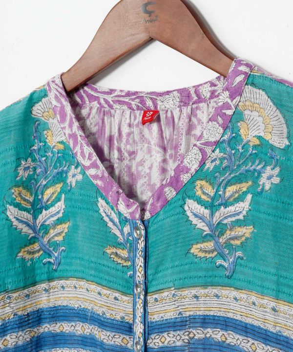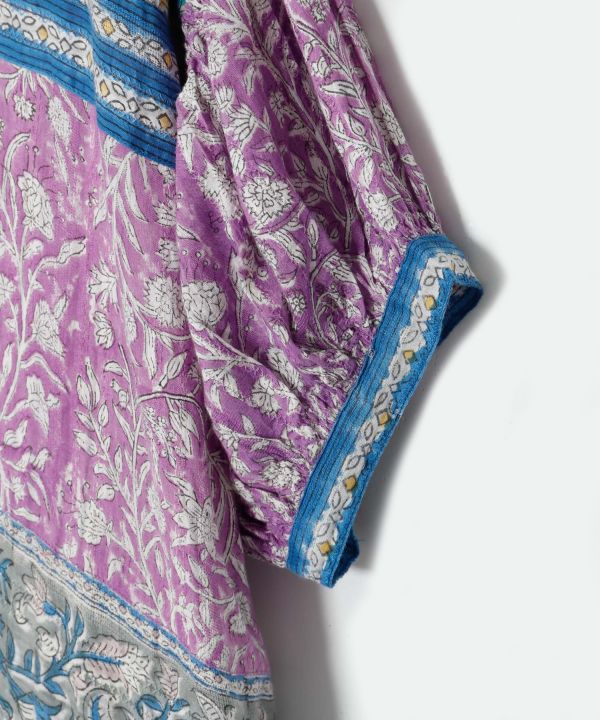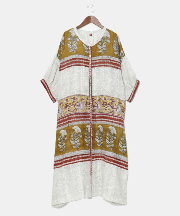 いくつものブロックプリントをパッチワークで表現したワンピース。腕を通す部分は伸縮性もあり、ゆったりと着用できます。ボタン仕様で、開けるとロングカーディガンとしても着用可能。素材のテクスチャーにもこだわっている、涼しげで上品な演出が出来る一枚。