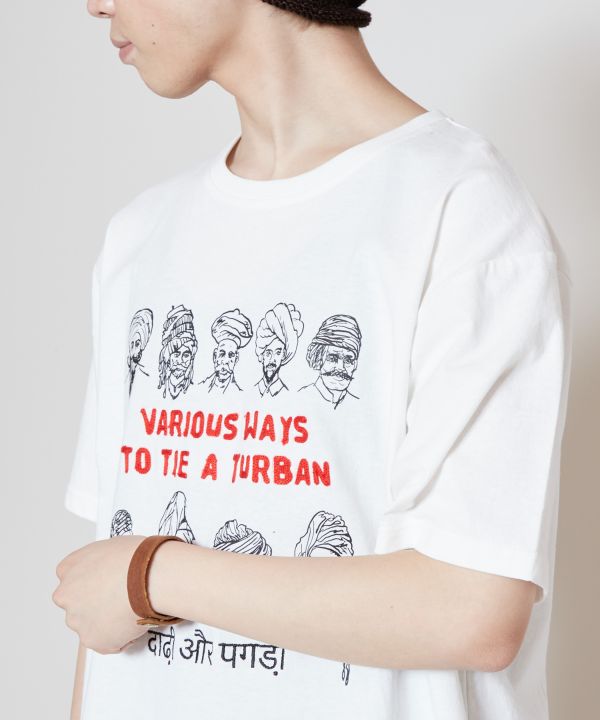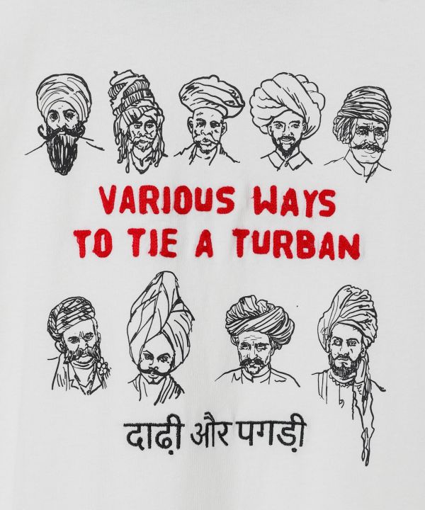 【Amina×grn】使うほど素肌に馴染むコットン素材のTシャツ。立体的な刺しゅうがポイント。インドでは豊かな髭は、男らしさと社会的地位のシンボル。ターバンは、自身のアイデンティティ。そんなインドのおじ様の「ターバンの結び方」。あなたの好きなおじ様は誰?