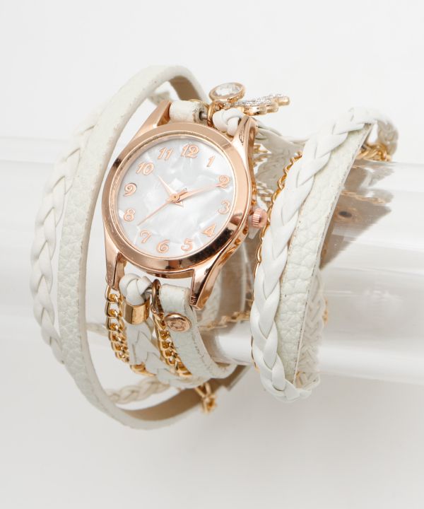 ハワイアンチャームのついた連ブレスレットの腕時計。大人っぽいカラーリングにゴージャスなデザイン。連ブレスレットになっているので1本で手首周りがボリュームアップ。