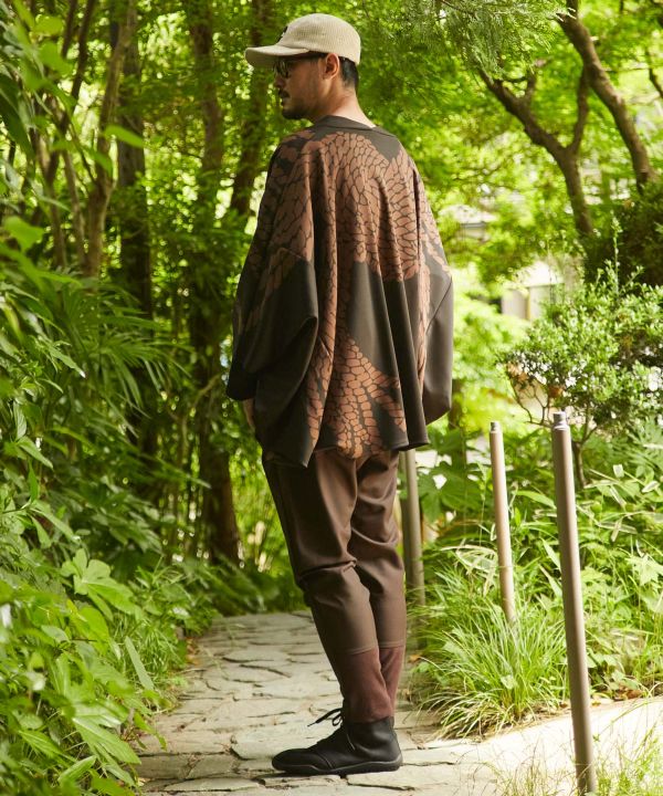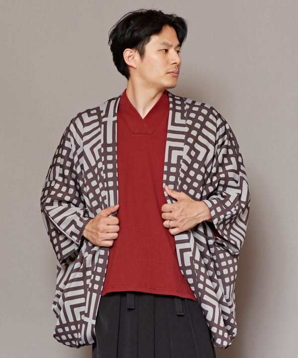 大胆な総柄のメンズ羽織り。動きやすく着心地の良い、ポリエステル素材でさらりとした着心地です。袖下は丸みのあるゆったりとしたデザイン。パンツと合わせてセットアップで着用すれば粋な和装コーディネートに。