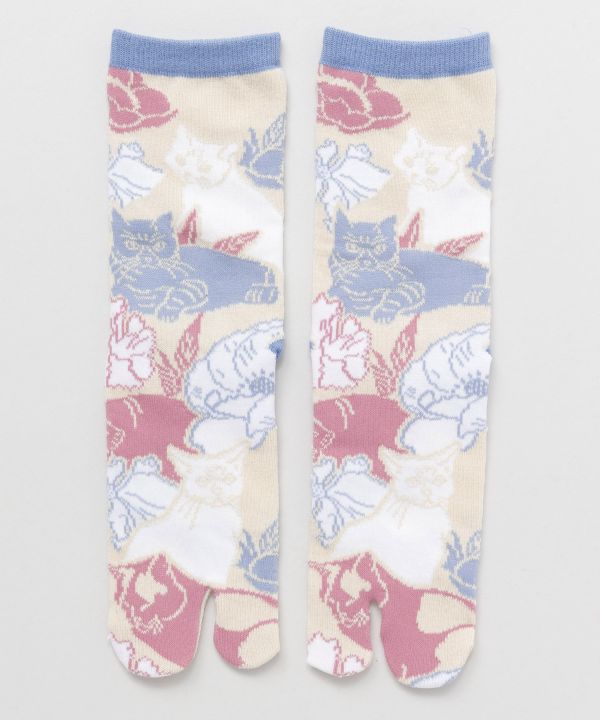 日本人の足にしっかり馴染んで履きやすい足袋靴下。足袋特有の履き心地。猫と花を描いた可愛らしい一枚。