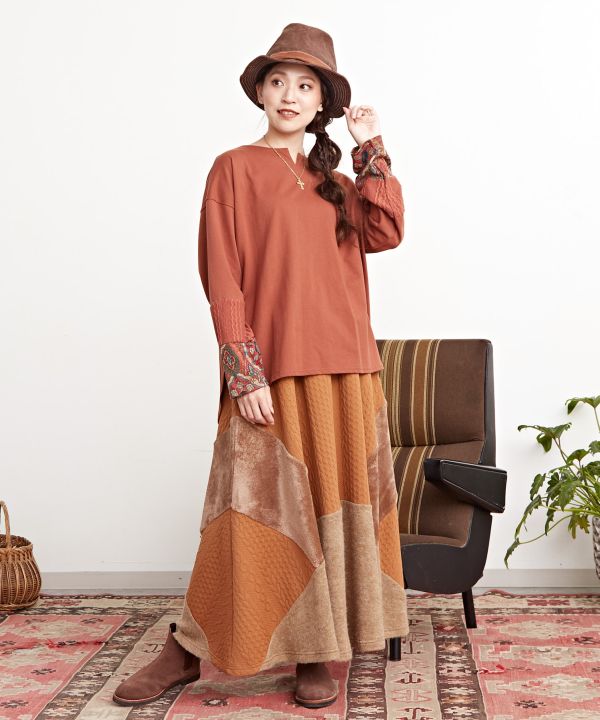 さらりとした生地感で着心地の良いロングTシャツ。袖口から切り替わるヴィンテージ感のある柄が目を惹き付ける。独特なパッチワークで遊牧民を表現。後ろが長いシルエットでレイヤードのしやすい一枚。