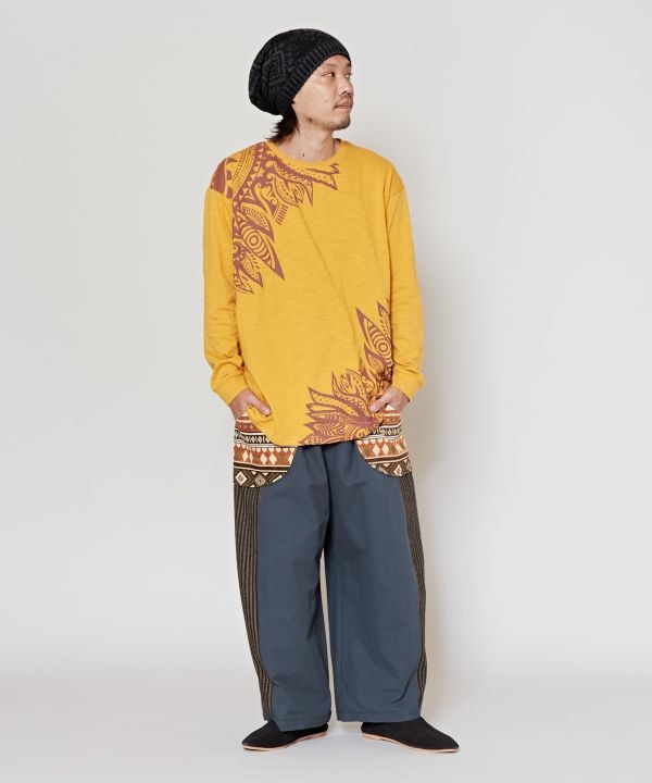 ネイティブな羽柄をトライバル柄で大胆に表現したメンズTシャツ。使いやすい色展開と肌馴染みの良い素材感で、抜群の着回し力。風合いのあるスラブ天竺で着心地も良し。