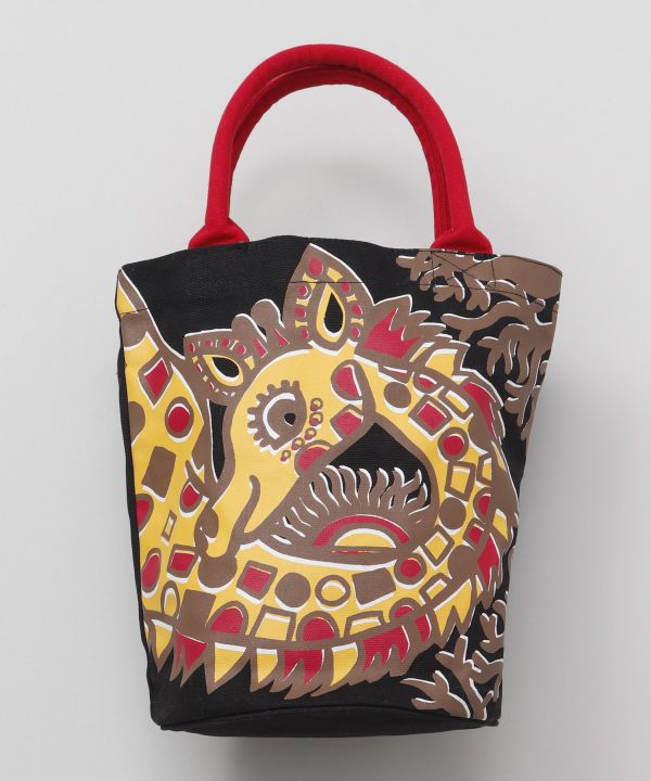 アフリカ・タンザニアのポップアート、ティンガティンガのユーモラスでいきいきとした動物をモチーフにしたバッグ。プリントデザインの為コーディネイトの引き立て役に。取っ手の部分がバッグとバイカラーなところも楽しい。ボタンはマグネット式。