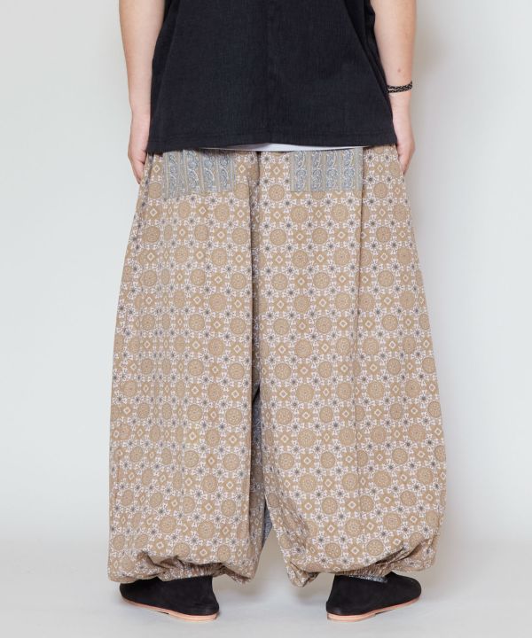 インドの伝統技法であるアジュラックプリントの柄と、インド更紗によく使用される伝統的なペイズリー柄をパッチワークしたメンズパンツ。裾とウエストはゴム仕様になっておりサイドと後ろ身頃にポケットあり。絶妙な変形シルエットで他と被らない一枚。
