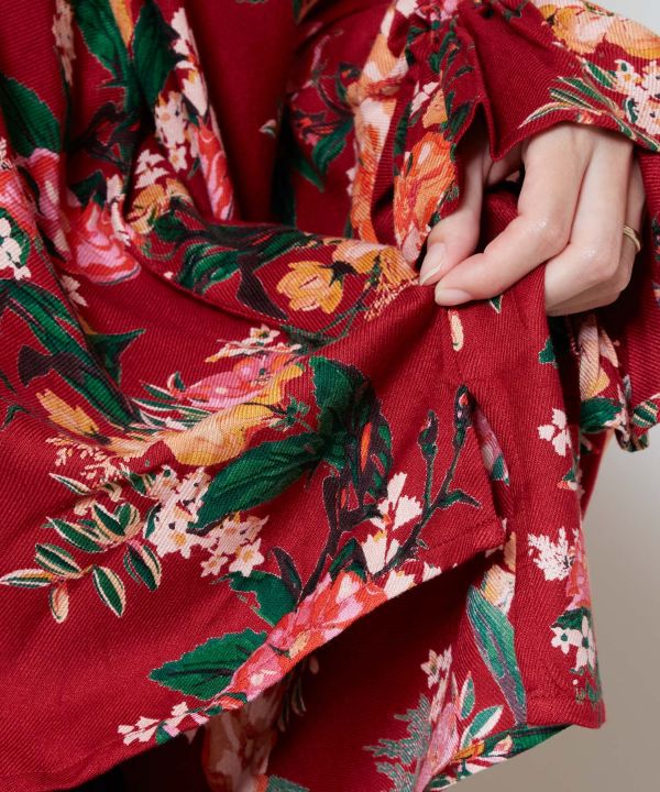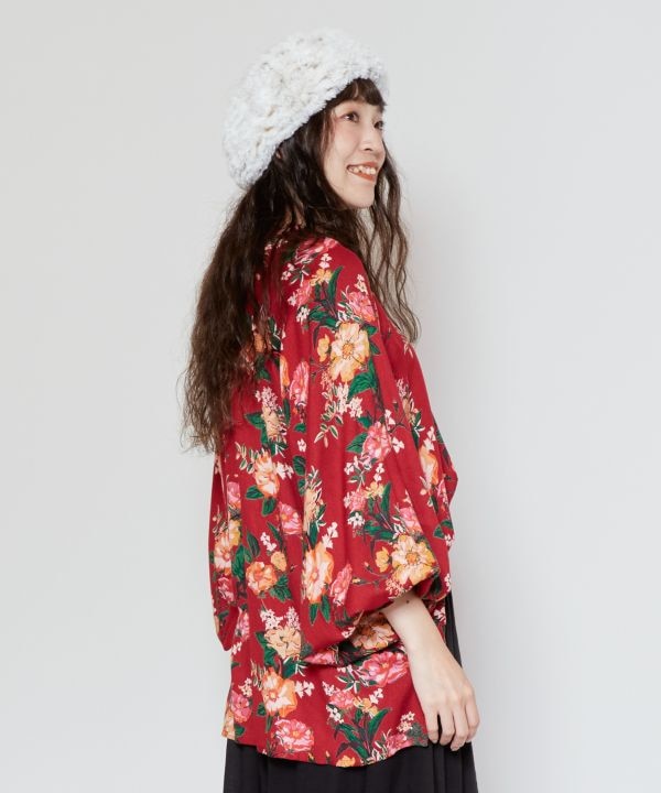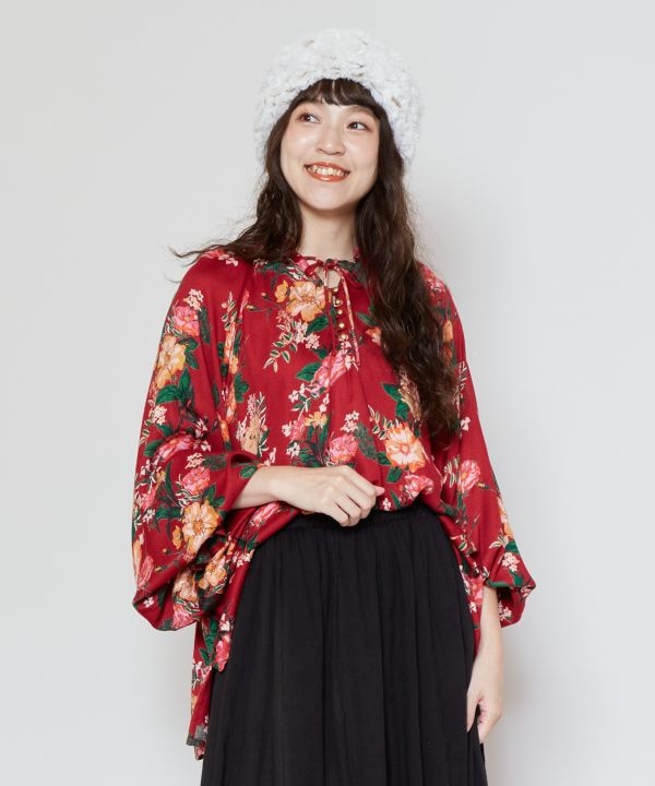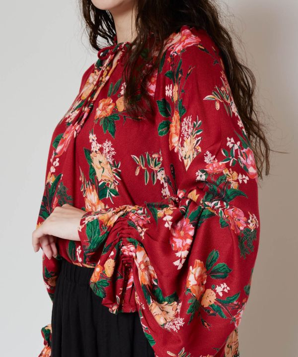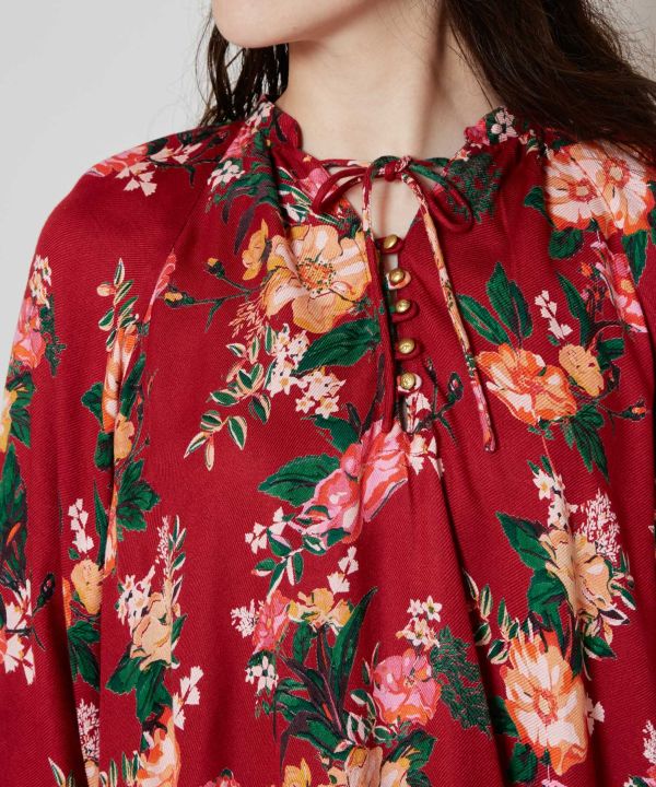 ルーマニアの国花イヌバラ(ドッグローズとも言う)をモチーフした花柄トップス。鮮やかな色を存分に使った華やかな柄と、揺れ感のあるレーヨン素材が魅力。ギャザー入りのフレア袖はルーマニアの民族衣装から取り入れたデザイン。