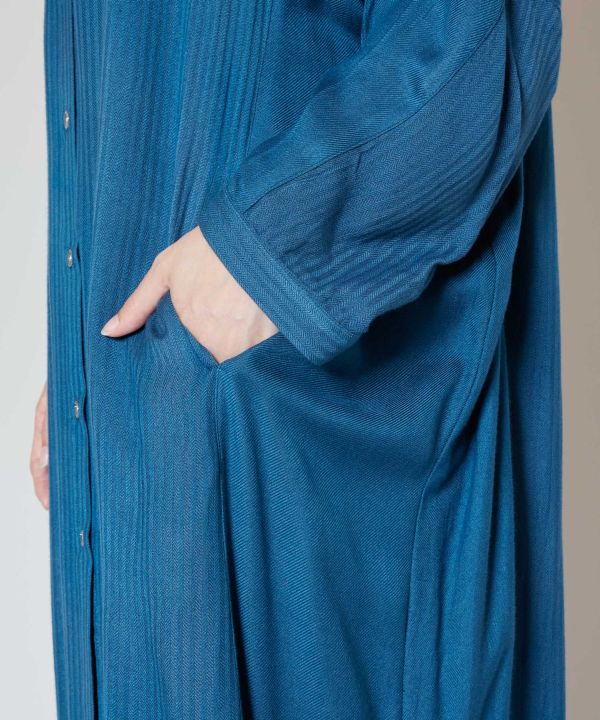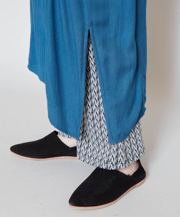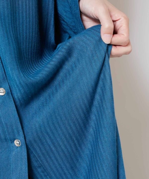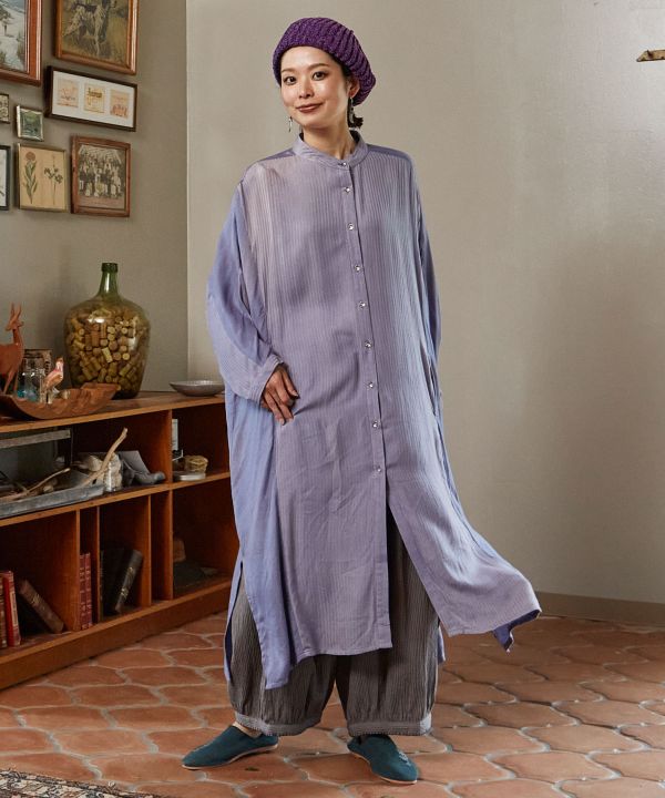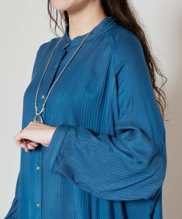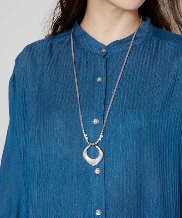 落ち感のあるレーヨン素材でスッキリ見える、ロング丈シャツ。背中にある大胆な刺しゅうは、トゥワレグ族のシルバーアクセサリーの中のトゥワレグの十字架をモチーフに。この十字架には魔よけや幸運のお守りという意味がある。トゥワレグ族が青の民と呼ばれていることと、シルバーアクセサリーにちなんで、青色と銀糸で刺しゅうを施し表現した。ボタンもシルバーアクセ風のシルバーのボタンに。ポケット付き。