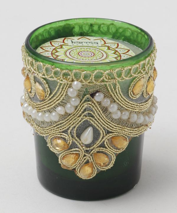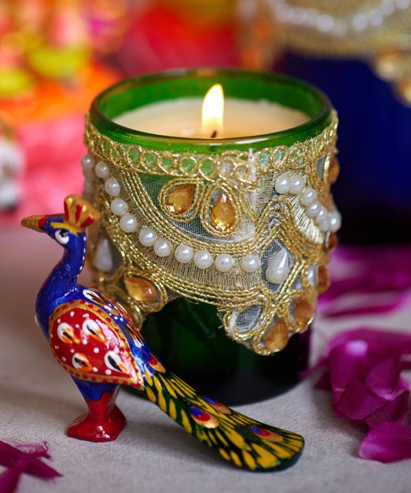 装飾が施されたカラフルなキャンドル 。インドのラジャスタンを感じさせるようなカラーリングが空間をゴージャスに演出。5種類の香りが選べます。
