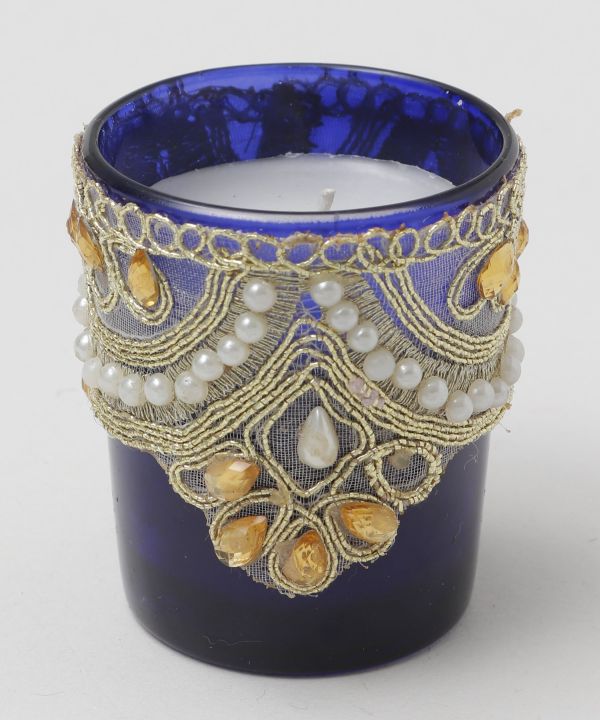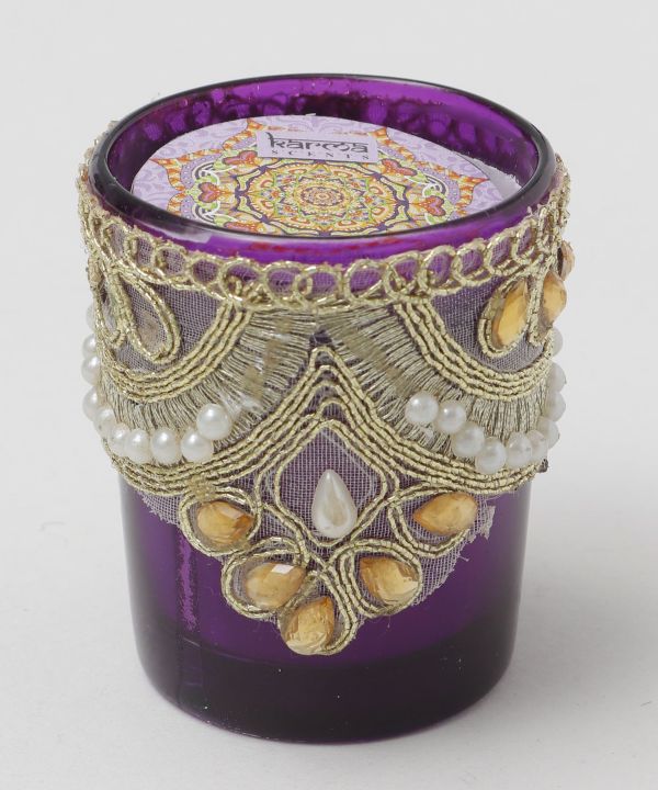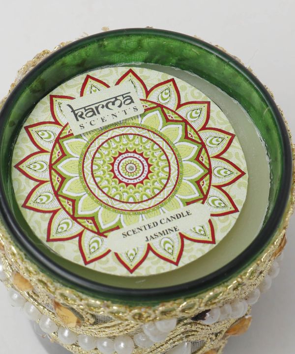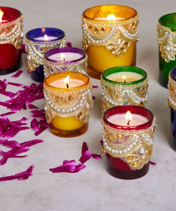 装飾が施されたカラフルなキャンドル 。インドのラジャスタンを感じさせるようなカラーリングが空間をゴージャスに演出。5種類の香りが選べます。