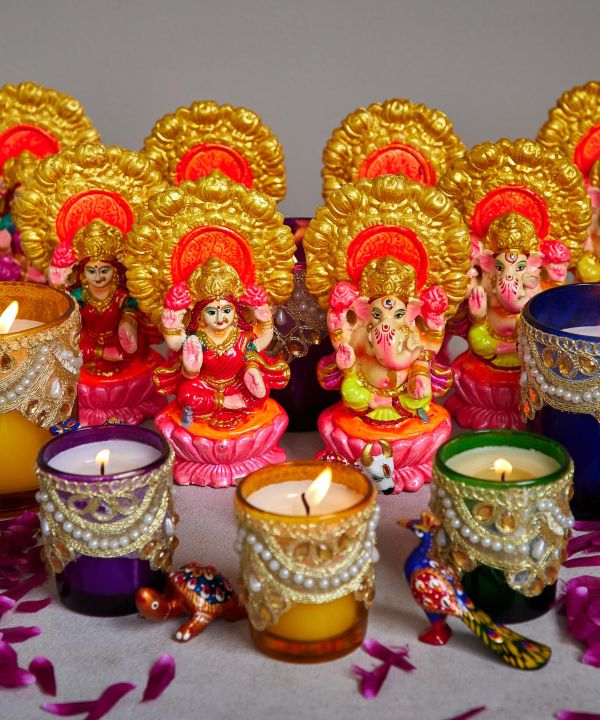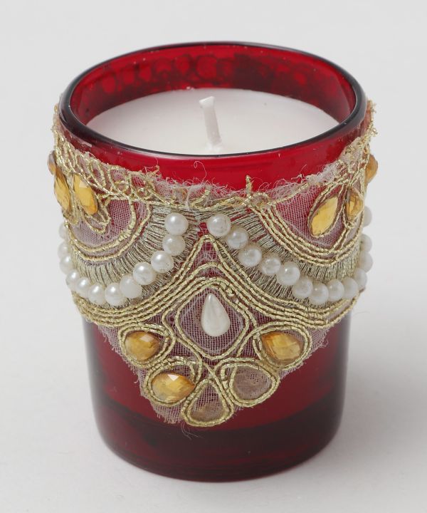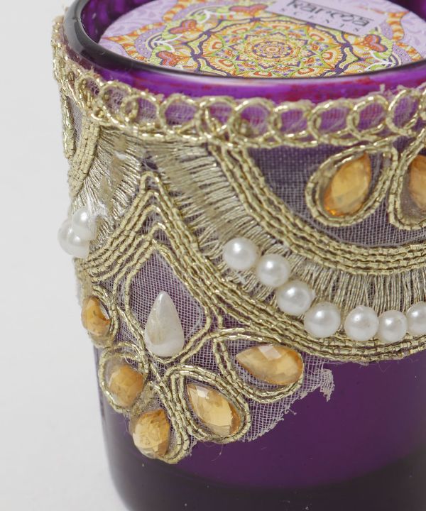 装飾が施されたカラフルなキャンドル 。インドのラジャスタンを感じさせるようなカラーリングが空間をゴージャスに演出。5種類の香りが選べます。
