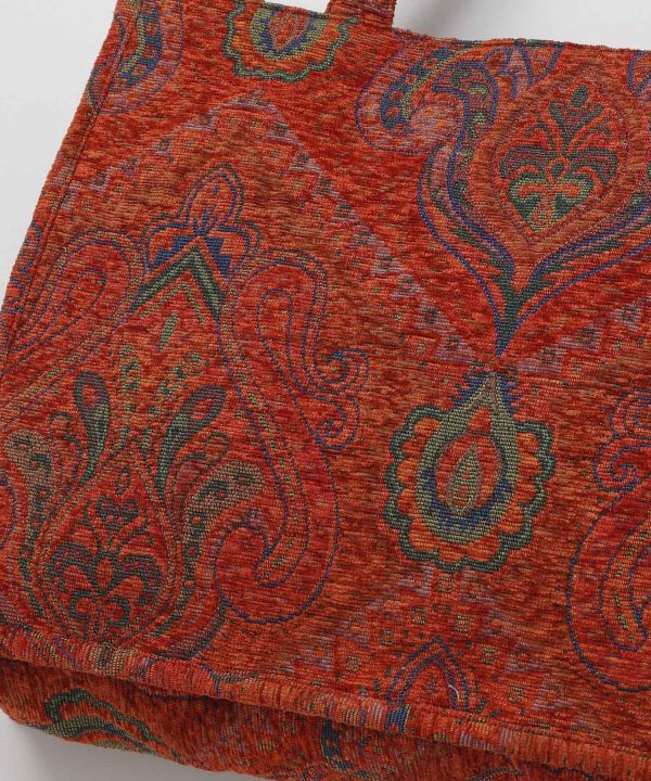 普段のコーディネートに華やかさをプラスしてくれるトートバッグ。ヴィンテージのターキッシュラグを連想させるベルベットのジャカード生地。内側にはファスナーポケットと携帯が入るサイズのポケット付き。
