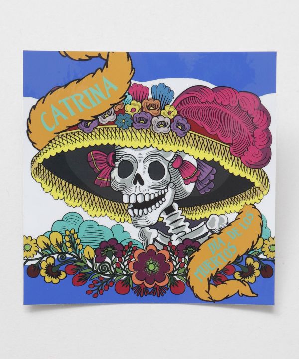 メキシコ死者の日のガイコツ=カラベラ。メキシコでカラベラは喜びの象徴とされており、来世での幸せな生活を示すため、カラフルにお祝い事をしたり、踊ったり楽器を弾いたりしています。そして亡くなった聖人や死者を偲び、感謝し、生きる喜びを分かち合う。その特別な日を表現したステッカーです。防水加工、UVカット加工あり。