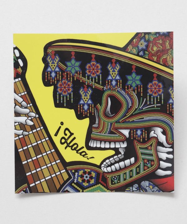 メキシコ死者の日のガイコツ=カラベラ。メキシコでカラベラは喜びの象徴とされており、来世での幸せな生活を示すため、カラフルにお祝い事をしたり、踊ったり楽器を弾いたりしています。そして亡くなった聖人や死者を偲び、感謝し、生きる喜びを分かち合う。その特別な日を表現したステッカーです。防水加工、UVカット加工あり。
