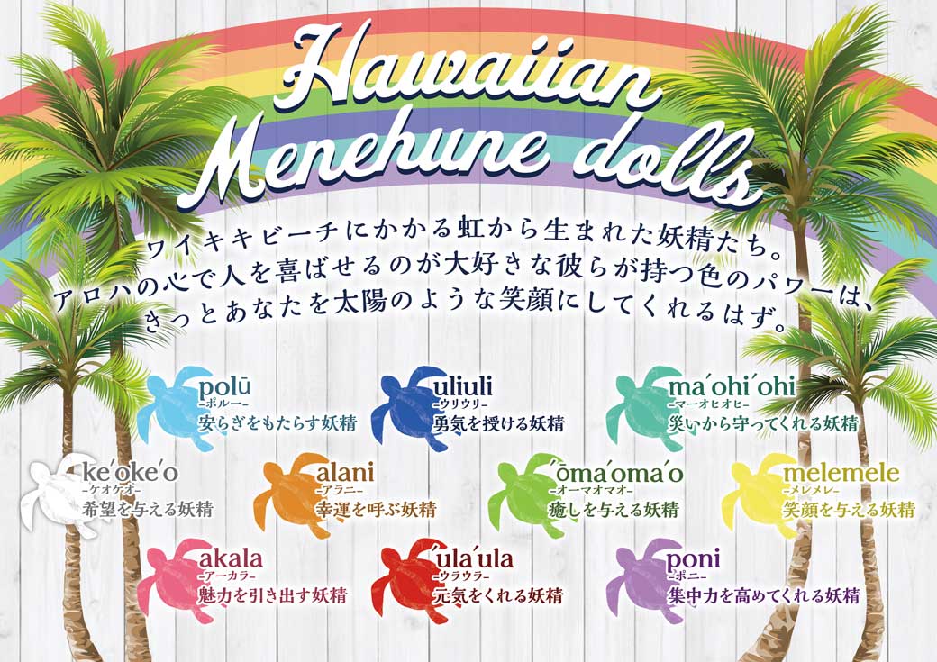 ワイキキに架かる虹の橋を渡ってやってきた、ハワイの妖精メネフネドールのオーナメント。紐付きなのでツリーや車にかけてもかわいい。それぞれの色に意味が込められているので、願いを込めた贈り物にもおすすめです。