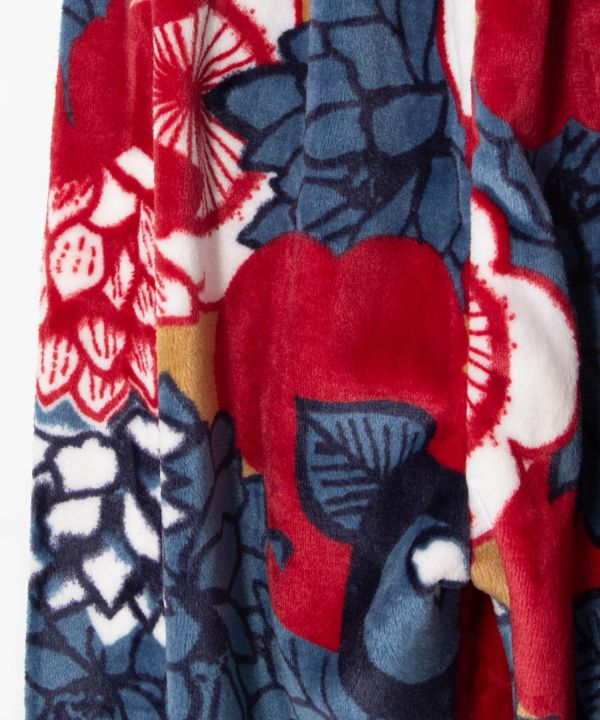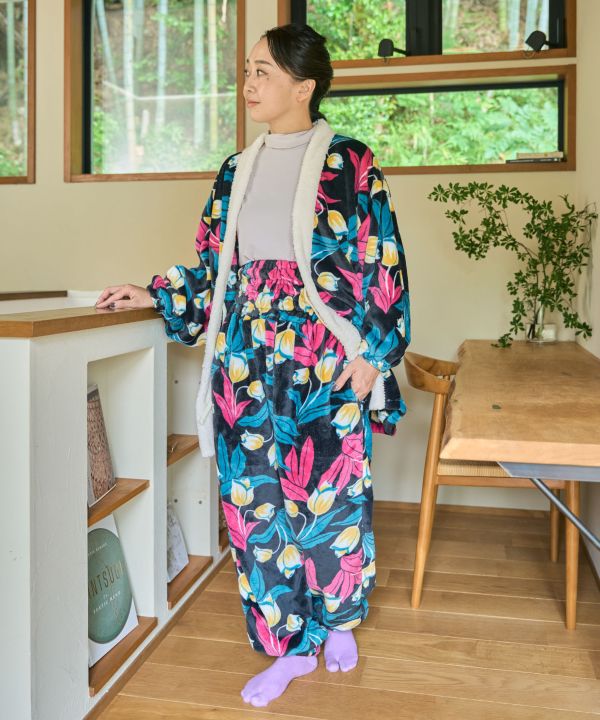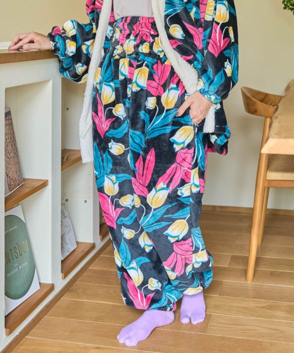 日本の花や浮世絵などのモチーフをデザインした、暖かなブランケット素材のもんぺ。腰の部分のゴムが腹巻のようにフィットする、お尻もしっかり暖かいボアパンツ。左右にポケット付き。ご自身用にはもちろん、大切な方への贈り物にもおすすめです。