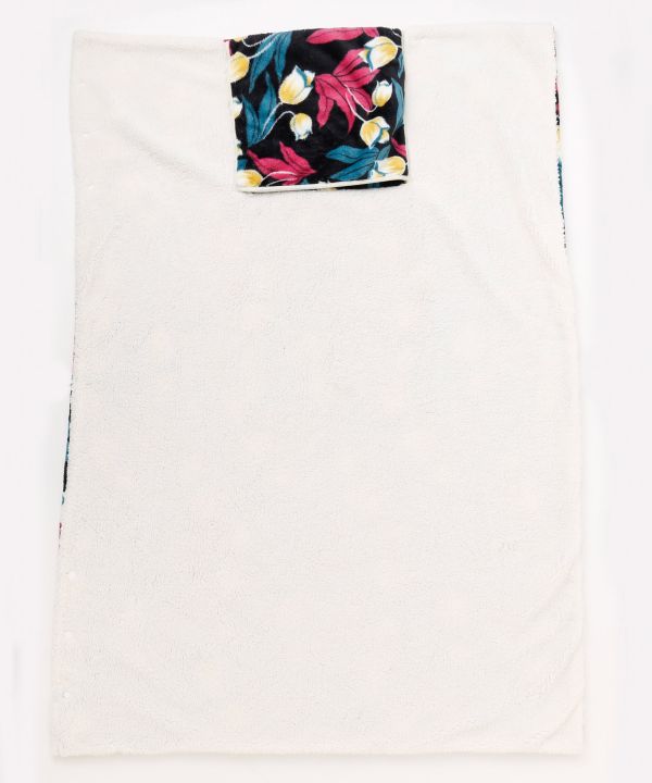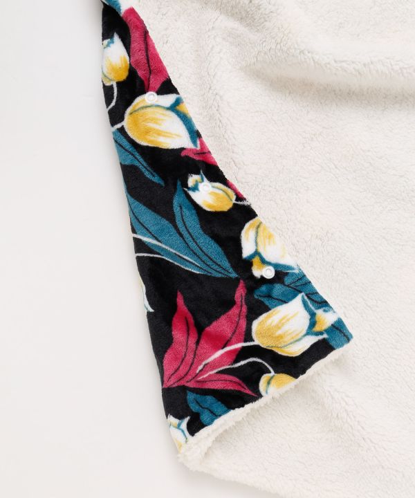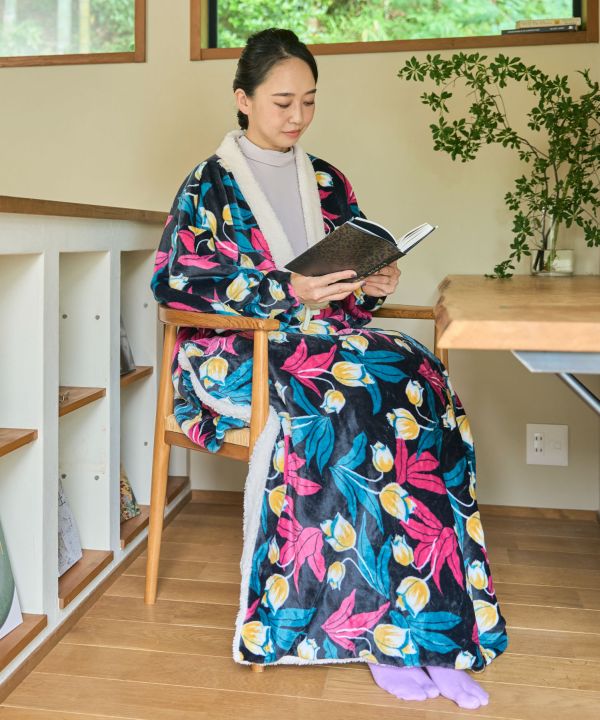 日本の花や浮世絵などのモチーフをデザインしたブランケット。表は滑らかな肌触り、裏はふんわりとしたボア素材。2枚合わせのため保温性抜群です。広げてひざ掛けに、ポケットにしまい込むと座布団としてお使いいただけます。ご自身用にはもちろん、大切な方への贈り物にもおすすめです。