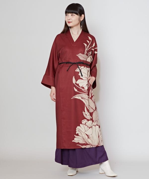 まるで着物のようなシルエットのワンピース。厚みがあり高級感のある生地を使用し、年末年始など着物の代わりや晴れ着としても着用できます。鉄線の花柄を繊細かつ大胆に使用した華やかなデザイン。