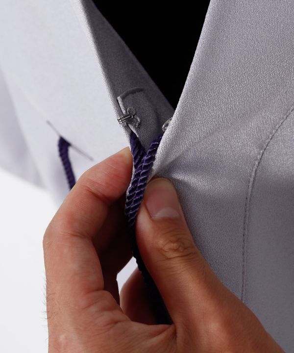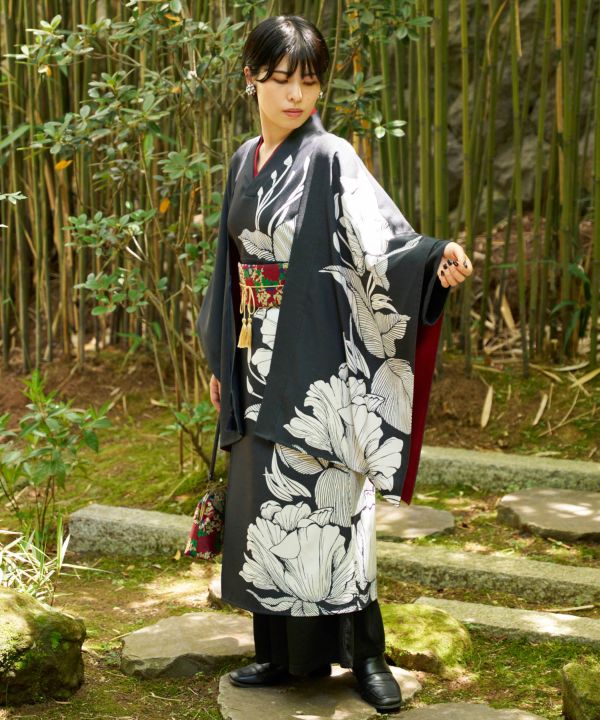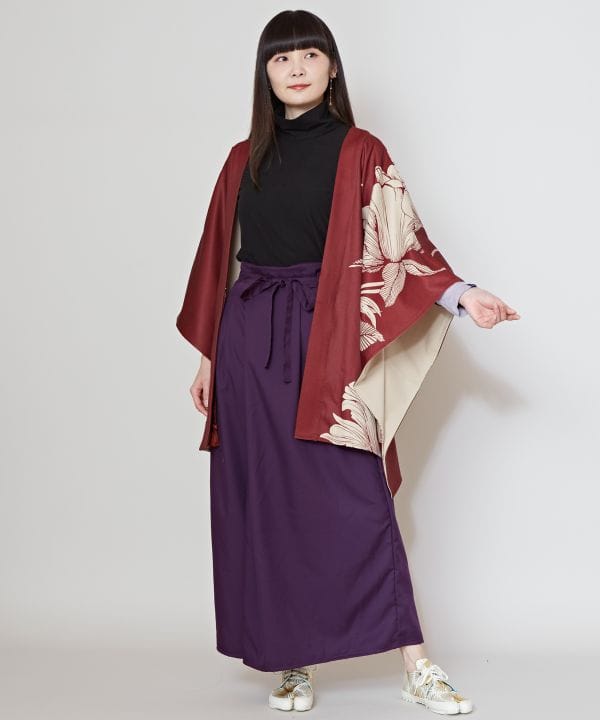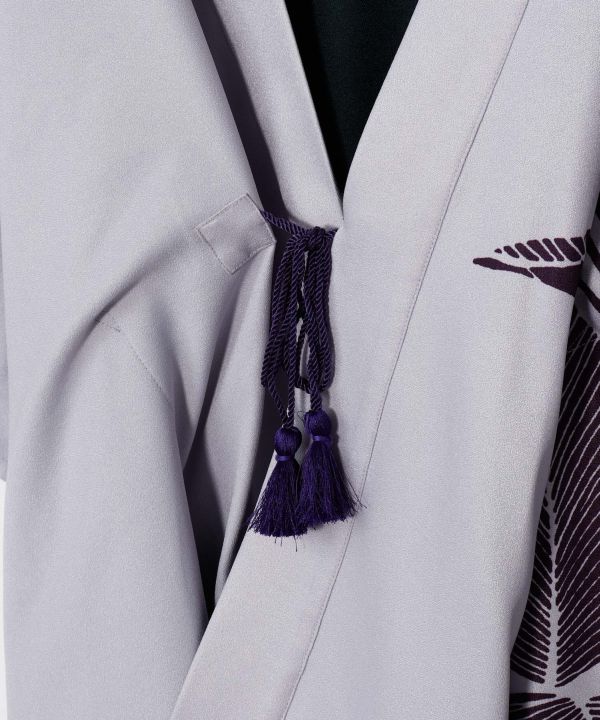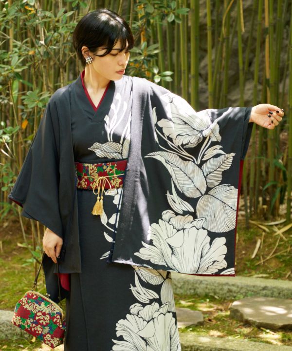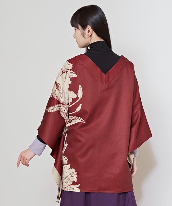まるで着物羽織のようなデザインのゆったりとした羽織。厚みがあり高級感のある生地を使用し、年末年始など着物の代わりや晴れ着としても着用できます。鉄線の花柄を繊細かつ大胆に使用した華やかなデザイン。