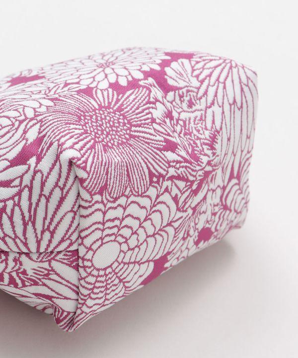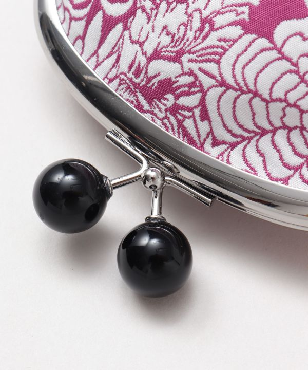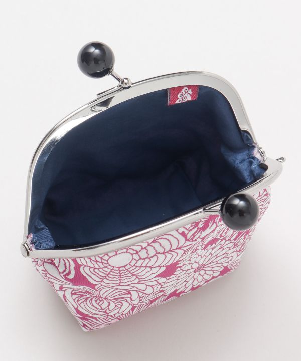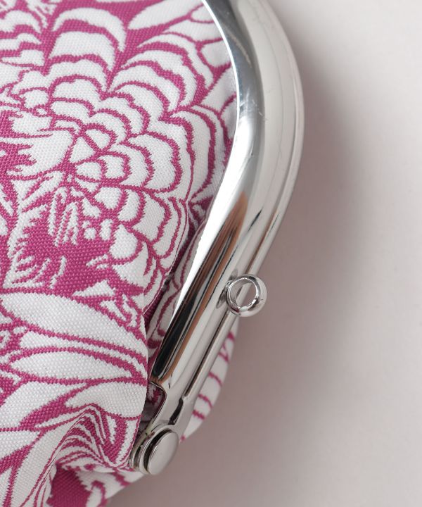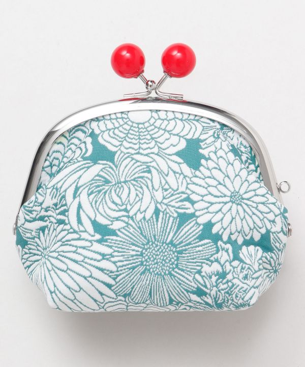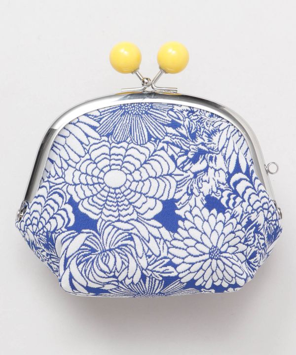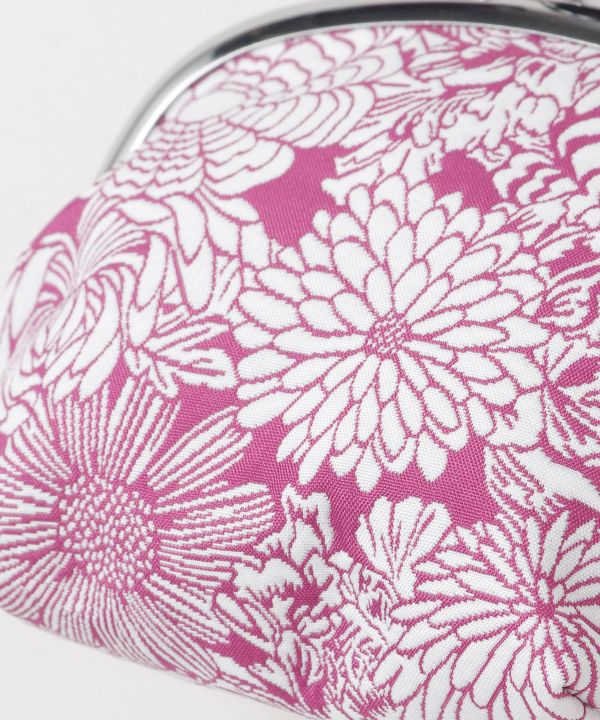 お菓子や小物を入れるのにピッタリのマルチサイズのがま口。たくさんの花々が描かれた、色鮮やかな花ふくれシリーズ。凹凸のあるふくれ生地は着物の襟にも使われる。口金に使われている大玉がアクセント。