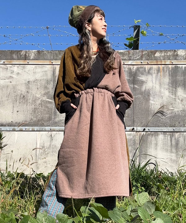 チベットの民族衣装から発想されたシルエットが個性的なワンピース。軽くて手触りの良い裏起毛素材。チベット民族をイメージした色展開。