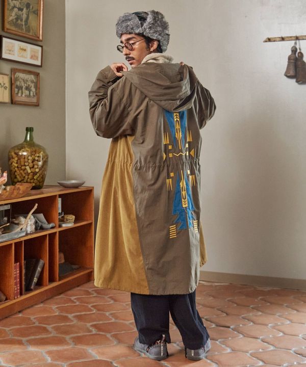 遊牧民の願い、平和の祈りの象徴でもあるアロー(矢のモチーフ)が背に描かれたユニセックスコート。大胆な刺しゅうとパッチワークで表現されており、他にはない個性と存在感を放つ。インナージャケットは単品でもコーディネートが可能。ジャケットを外せばスプリングコートとしても長く楽しめる一枚。インナーあり・インナーなし・インナーのみの3WAY着用が可能。