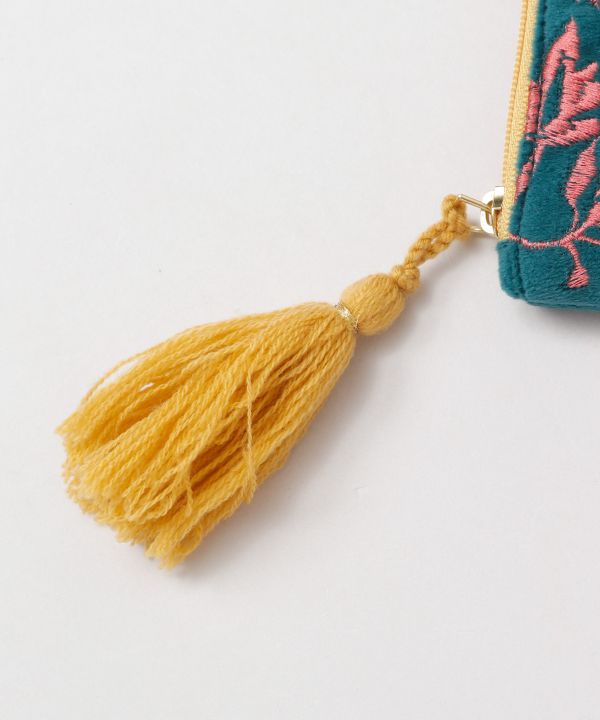 メキシコの死者の日の祭りやメキシコカルチャーからインスパイアを受けた総刺しゅうのポーチ。鳥と花のモチーフが大胆なオトミ族の伝統刺しゅうをイメージ。ボリューム感のあるタッセルもワンポイントに。