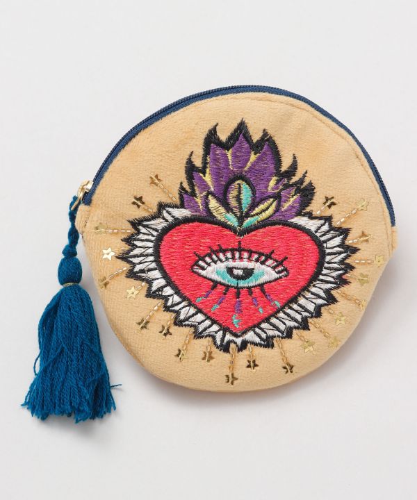 メキシコの死者の日の祭りやメキシコカルチャーからインスパイアを受けた総刺しゅうのポーチ。間口が大きく開く丸型で使いやすさ抜群。豪華な刺しゅうとビーズが魅力的。メキシコには願い事や希望の象徴として、ミラグロ(英語ではミラクルの意)と呼ばれる金属製の小さなチャームを身につけたり、十字架に打ち付けるカルチャーがあります。そのミラグロのハートモチーフをデザインに落とし込みました。