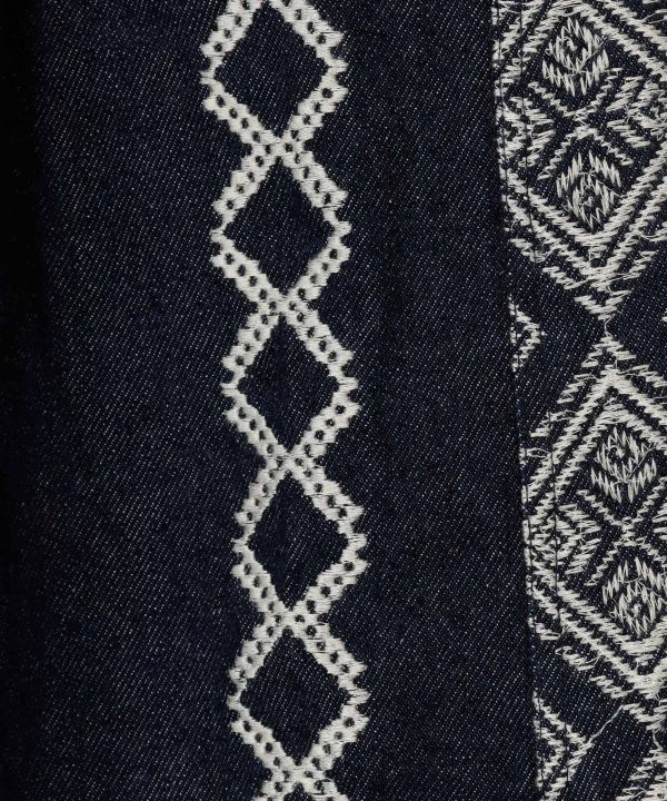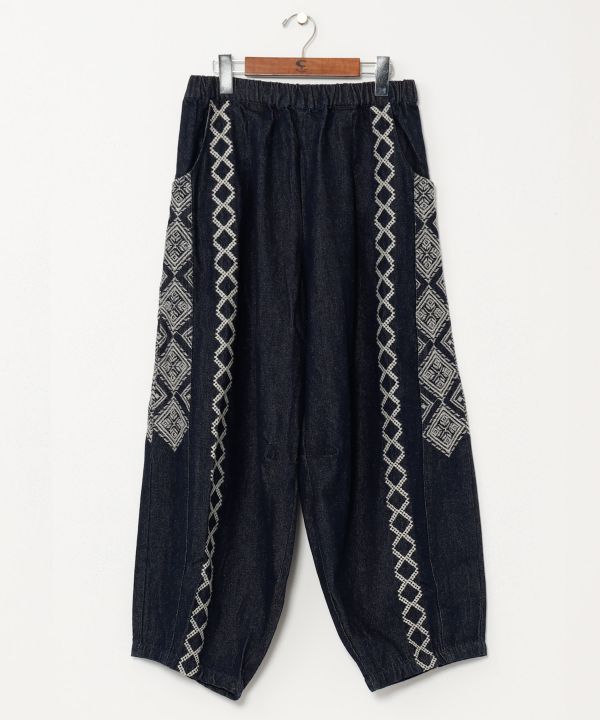チベット民族をテーマに、伝統柄にインスピレーションされた刺しゅうのデザインパンツ。やわらかいデニム生地の組み合わせしやすく、コーデの幅が広がる。たっぷり着れる太めのラインと、タックの遊びが面白い。