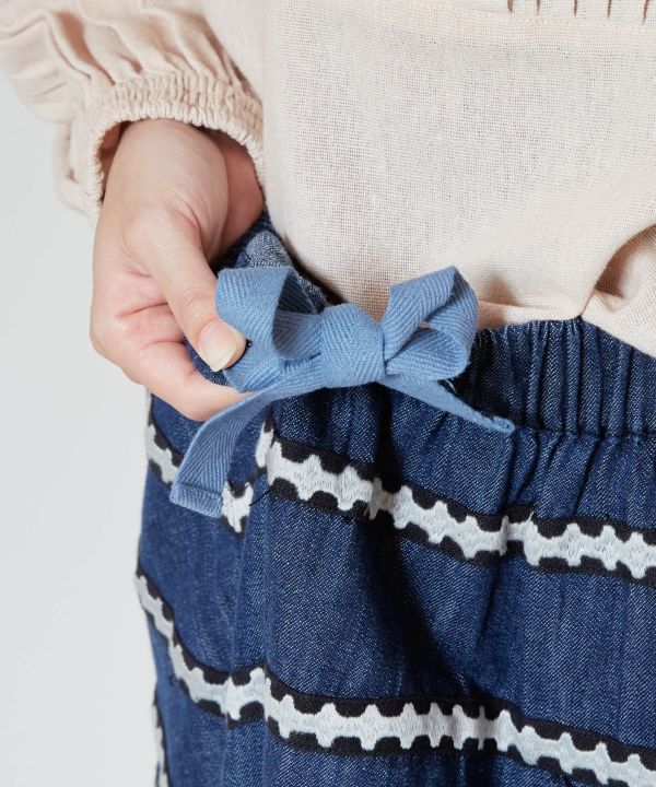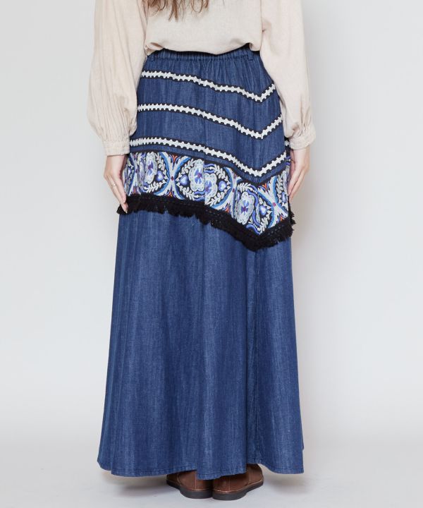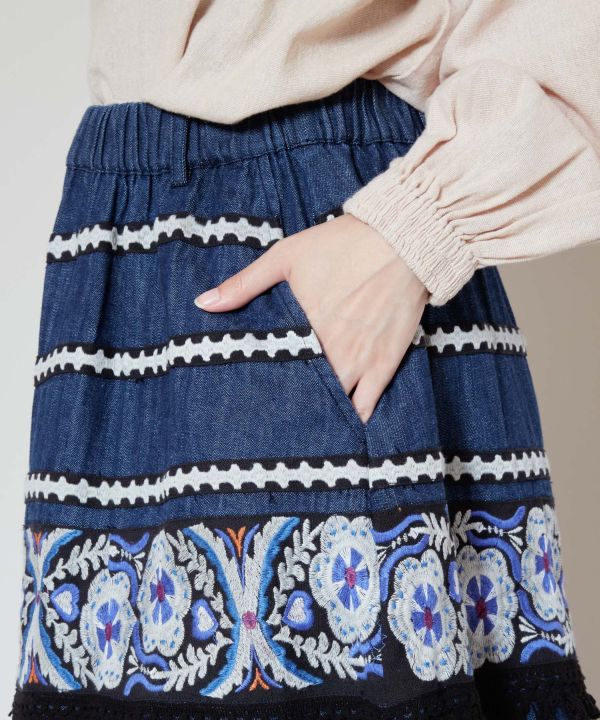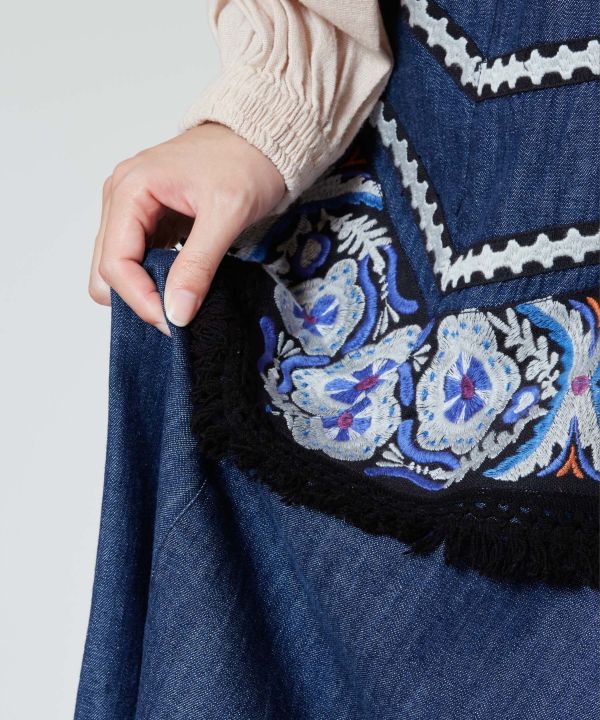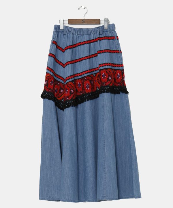 やわらかいデニム生地のスカート。騎馬遊牧民・ハンガリーのマジャール人からインスパイアされたデザイン。移動が多い遊牧民ならではの、重ね着をする仕様が特徴。まるでスカーフを重ね着しているかのようなデザインが目を引く。マジャール人が現代まで引き継ぐ、華やかな刺しゅうモチーフを楽しむことができる一枚。