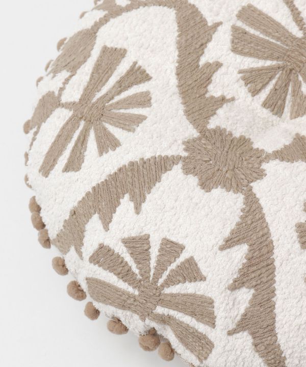 ウズベキスタンなど中央アジアの遊牧民に伝わる伝統の刺しゅう「スザニ」からインスパイアを受けた刺しゅうを大胆に施した、中綿入りの丸クッション。ソファや車を華やかに演出。しっかりした中綿なので、座布団として使用可能。