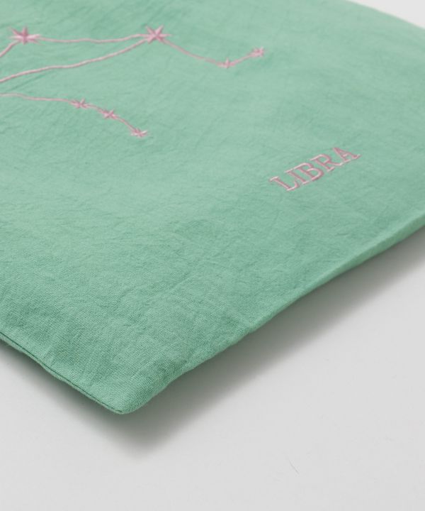 星座の刺しゅうが施されたカラフルなトートバッグ。内ポケットにくるんと収納すればコンパクトに持ち運べるパッカブル仕様。小さく畳んだ部分にも星座の刺しゅうが施されています。