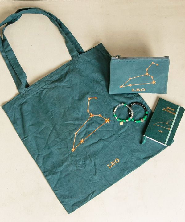 星座の刺しゅうが施されたカラフルなポーチ。カード入れにしてもよし、イヤホンやリップなど、持ち歩き用の収納にもってこい。
