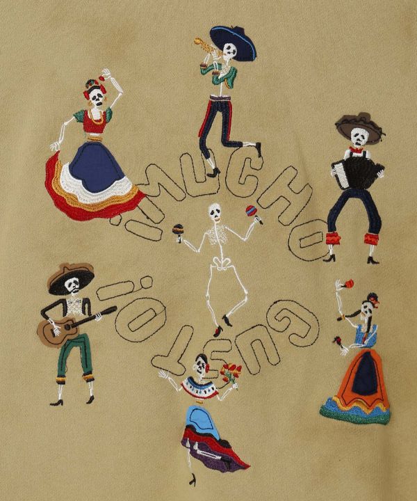 【Amina×grn】メキシコがテーマのメンズトップス。カラベラが歌ったり、踊ったりするパーティを表現した一着。バックスタイルのカラベラもワンポイント。しっかりとした裏毛素材。万能に使える一枚。