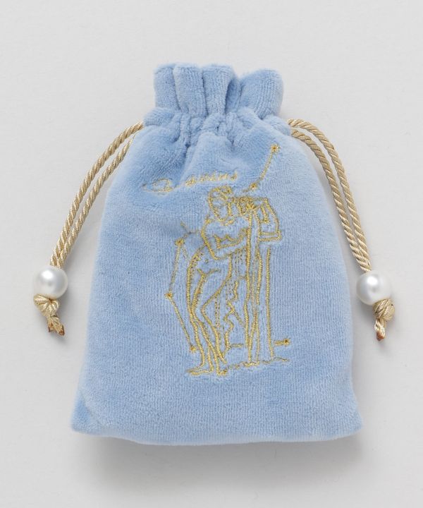 ヨーロッパで描かれた12星座のデザインを刺しゅうした巾着ポーチ。光沢のあるベロア生地が贅沢感のある上品な印象。 ちょっとした小物やアクセサリーにちょうど良いサイズ感。ギフトラッピングにもオススメです。