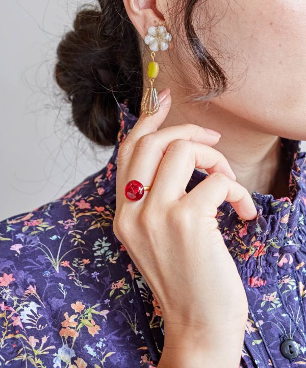 伝統のチェコガラスを使用したシンプルなデザインのリング。どんな洋服にもコーディネートしやすいレトロな雰囲気漂うカラーのリングは、プレゼントにもおすすめです。サイズ調整可能。