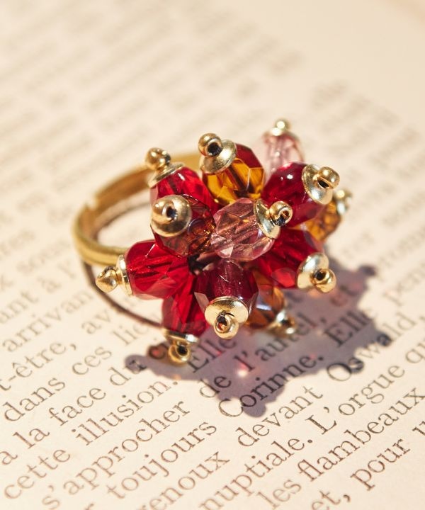 伝統のチェコガラスをふんだんに使用したゴージャスなリング。様々な色が混ざり合い、ヴィンテージ感が漂うリングは、蚤の市で見つけてきたよう。リングをつけるだけで、手元が華やかに。サイズ調整可能なので、プレゼントにもおすすめです。