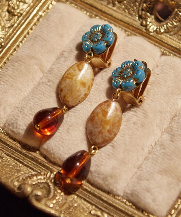 伝統のチェコガラスを使用した存在感のあるイヤリング。お花のパーツが可愛らしく印象的。レトロ感たっぷりのビーズが揺れるデザインは、お顔周りに明るい印象をプラスします。