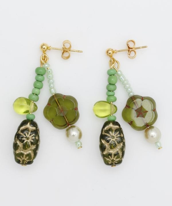 いろいろな形のチェコガラスのビーズがついたユニークなピアス。可愛らしいデザインの中にも個性を感じさせます。ノスタルジックな雰囲気のカラーに、ゆらゆらと耳元で揺れるようなデザインがポイント。