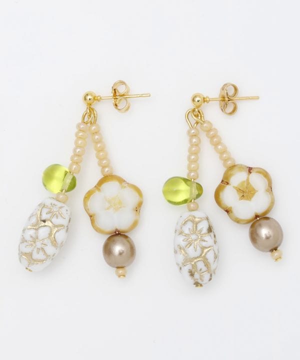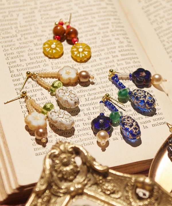 いろいろな形のチェコガラスのビーズがついたユニークなピアス。可愛らしいデザインの中にも個性を感じさせます。ノスタルジックな雰囲気のカラーに、ゆらゆらと耳元で揺れるようなデザインがポイント。