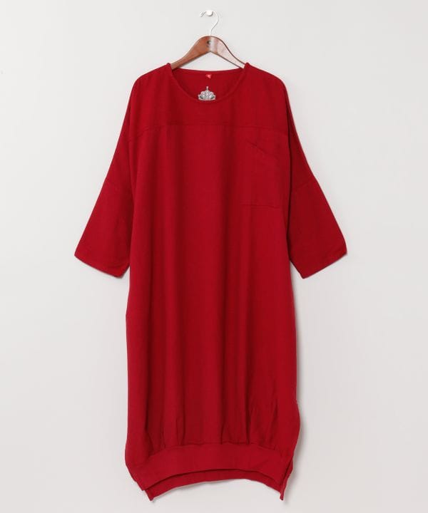 ネパールコットンの着用を重ねるほど馴染んでいく風合いと、やわらかさ抜群のワンピース。個性的な胸ポケットがポイント。背面の八吉祥のひとつである蓮のモチーフは、清らかさや純粋さを意味する。曇りない心で旅を楽しめるようという願いをこめて。バサッと楽に着られる一枚。