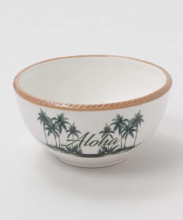 ヤシが上品にデザインされたボウル。ふちのウッド風ディティールがポイント。ハワイの想い出が蘇る上品なデザインで日々に彩りを。